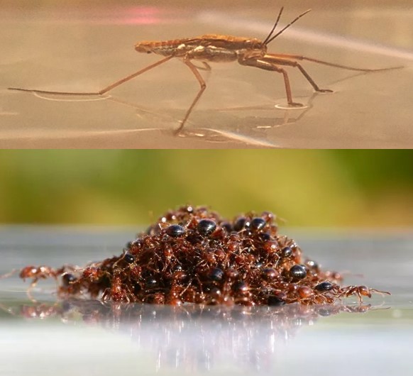 “Some insects have the ability to walk on water surface due to hierarchical leg structure and wax coating. In this study, resistance forces of water strider and fire ant legs to submersion in water, under their various orientations, were quantified using a high-sensitivity microbalance. Legs oriented parallel to water surface could support up to ten times as much force before immersion, compared to legs in a perpendicular orientation. Water pressure affected the setae structure differently at parallel and perpendicular approaches, and complete wetting was more difficult in the structure observed during parallel immersion. The wax coating on water strider legs was found to decrease adhesion force with little effect on immersion force. Overall, wax-coated strider legs, having conical setae with nanogrooves to facilitate removal of water, that are oriented parallel to the water surface, coated with wax, and have coned setae with nanogrooves to facilitate removal of water, are natural models for legs of a biomimetic aquatic robot when oriented parallel to the water surface.”